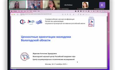 16 – 17 октября 2025 г. на базе Института социологии ФНИСЦ РАН состоялась юбилейная V Всероссийская научная конференция «Россия как цивилизация: социально-культурные основания российской жизни», организованная Советом молодых ученых Института социологии ФНИСЦ РАН. Результаты исследований ВолНЦ РАН были представлены в докладе младшего научного сотрудника Центра социокультурных и политических исследований А.Э. Ждановой, в котором были рассмотрены различные социокультурные характеристики молодежи Вологодской области на основе анализа данных социологического опроса «Социокультурных портрет региона» проводимого в рамках программы «Проблемы социокультурной эволюции России и ее регионов», основанной Н.Н. Лапиным.